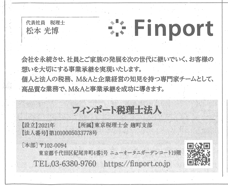 2026年3月23日(月)日本経済新聞全国版朝刊の、事業承継・M&A税理士30に、弊社フィンポート税理士法人が掲載されています。